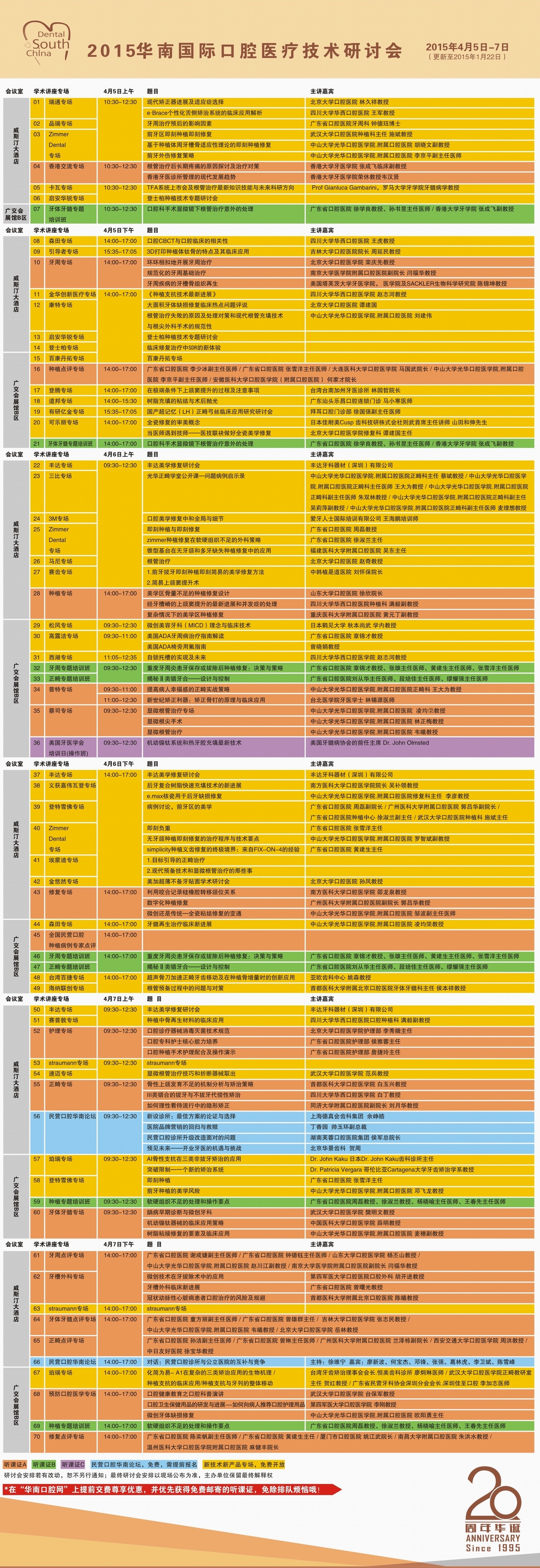 华南国际口腔展除展示丰富的牙科展品,每年展会同期都举办30多个专题60多场次的高水平技术研讨会。每年邀请到国内外知名口腔专家100多人分专题作演讲。学术研讨会一直以其权威性、学术性、前沿性、实用性在业界享有盛誉。特别是2008年首创的牙体牙髓、种植、修复、牙周、正畸案例点评专场,是口腔医生最感兴趣的会议。从2009年开始,华南国际口腔展开始和东盟各国牙科学会合作,联合组织东盟五国的口腔医学学术会议。精彩纷呈的学术活动,每年吸引牙科医生、专家、制造商达6000人以上。